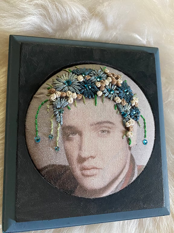 A tribute to Elvis in blues. I have printed his image onto cotton muslin and embroidered and embellished with glass rhinestones.