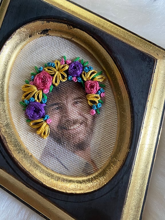 A tribute to Bob in multicolor. I have printed his image onto cotton muslin and embroidered his famous hair with an array of flowers.