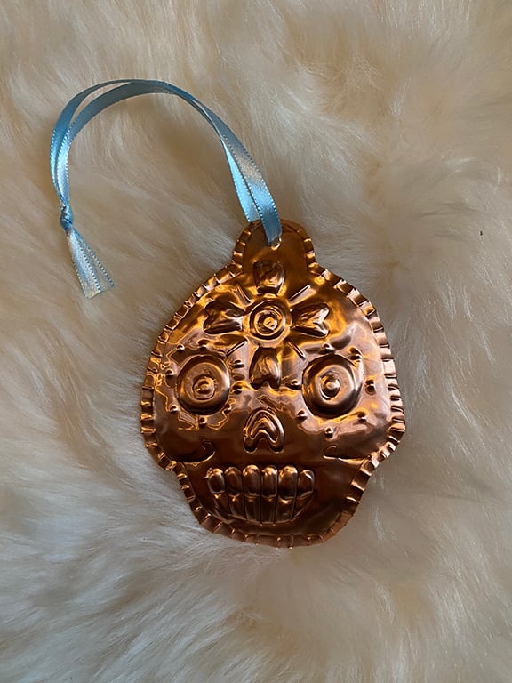 Sugar Skulls are so fun to make I nearly got carried away. This one is hand cut and tooled by yours truly. Ready to hang or gift.